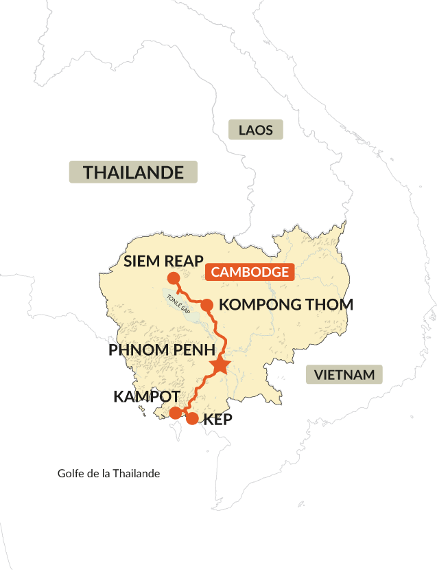 Après-midi, visite d’Angkor Thom (Grande Cité) en commençant par la terrasse du Roi Lépreux, plate forme qui présente plusieurs admirables figures sculptées d’apsaras. La visite se poursuit le long de la terrasse des Eléphants qui accueillait le faste des audiences royales et des cérémonies publiques. Continuation vers le portail Sud avec le fameux Temple Bayon, énigmatique et enchanteur, composé de 54 gigantesques tours décorées par 216 visages d’Avalokiteshvara (Bouddha de la compassion). Sur le chemin de retour, arrêt à Ta Prohm, temple que les restaurateurs ont laissé volontairement envahi par la jungle pour permettre aux visiteurs de ressentir les mêmes sensations que l’explorateur Henri Mouhout, lorsque celui-ci découvrit le monument en 1860.