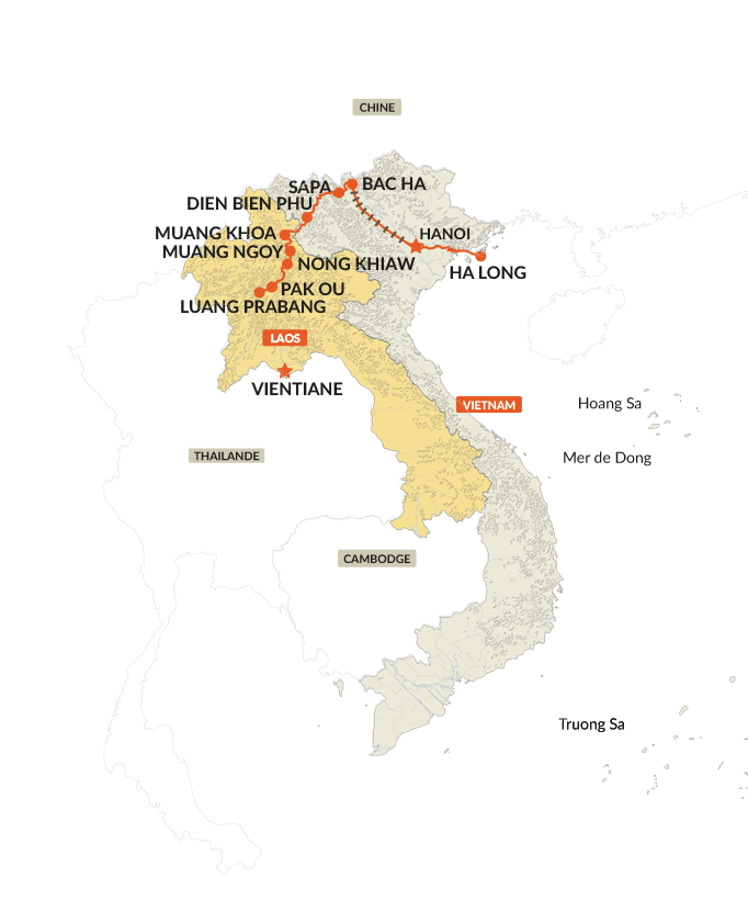 Descente de Sapa en direction de la moderne Lao Cai, ville frontière. Traversée de la ville et du fleuve Rouge, puis descente de sa vallée durant une quarantaine de km, avant de virer vers l’est et effectuer la jonction avec la rivière Chay. Remontée de celle-ci jusqu’au centre communal de Coc Ly. Visite du marché communal de Coc Ly (si c’est le mardi).