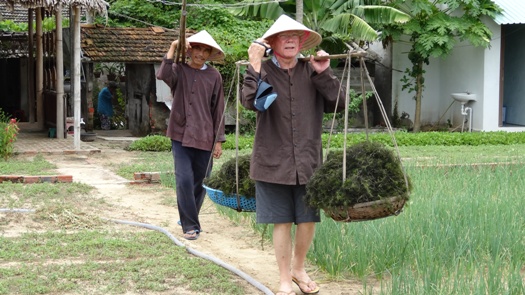 Hoi An. En route vers le village de Tra Que, village traditionnel de cultivateurs. Initiation à la découverte de toutes ces plantes aromatiques et même participation au travail de la terre et aux plantations.