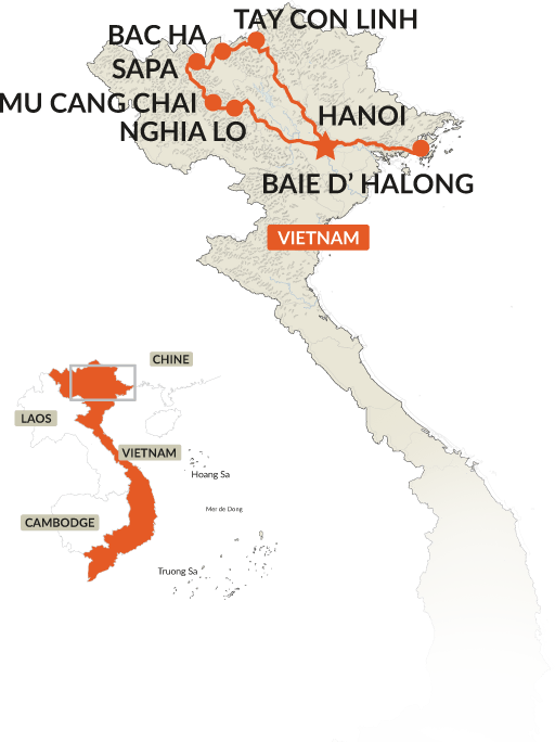 L’après-midi, descente de Sapa en direction de Bac Ha en passant par la moderne Lao Cai, ville frontière en bordure du fleuve Rouge. Traversée de la ville et du fleuve, puis descente de sa vallée durant une quarantaine de km, avant de virer vers l’est. Après le passage de la rivière Chay, montée sur le massif du même nom dont le sommet culmine sur tout le nord-est du pays. Les bosquets de résineux annoncent la proximité du bourg de Bac Ha.