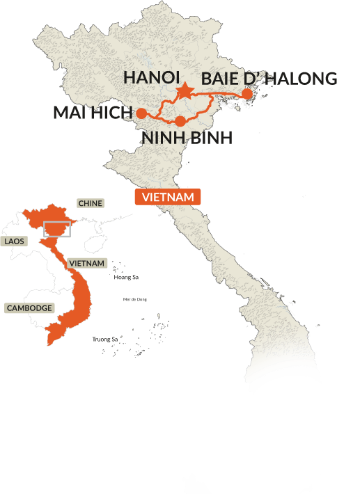 Après le déjeuner, court transfert au pont de Cau De. Là, un tour à vélo à travers des villages rizicoles typiques du delta du fleuve Rouge. Cette balade sur environ 12 km vous plonge dans le cadre de vie quotidien des habitants et permet de profiter de beaux paysages constitués de rizières, de cours d’eau et de pitons calcaires.
